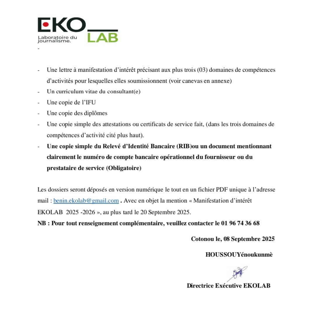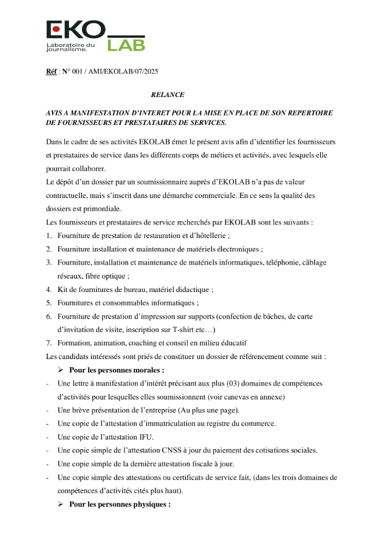 Dans le but de constituer une base de données qualifiée et actualisée, nous lançons un avis à manifestation d’intérêt pour la mise en place d’un répertoire de prestataires de services. Ce répertoire servira de référence pour nos futurs appels d’offres et consultations.